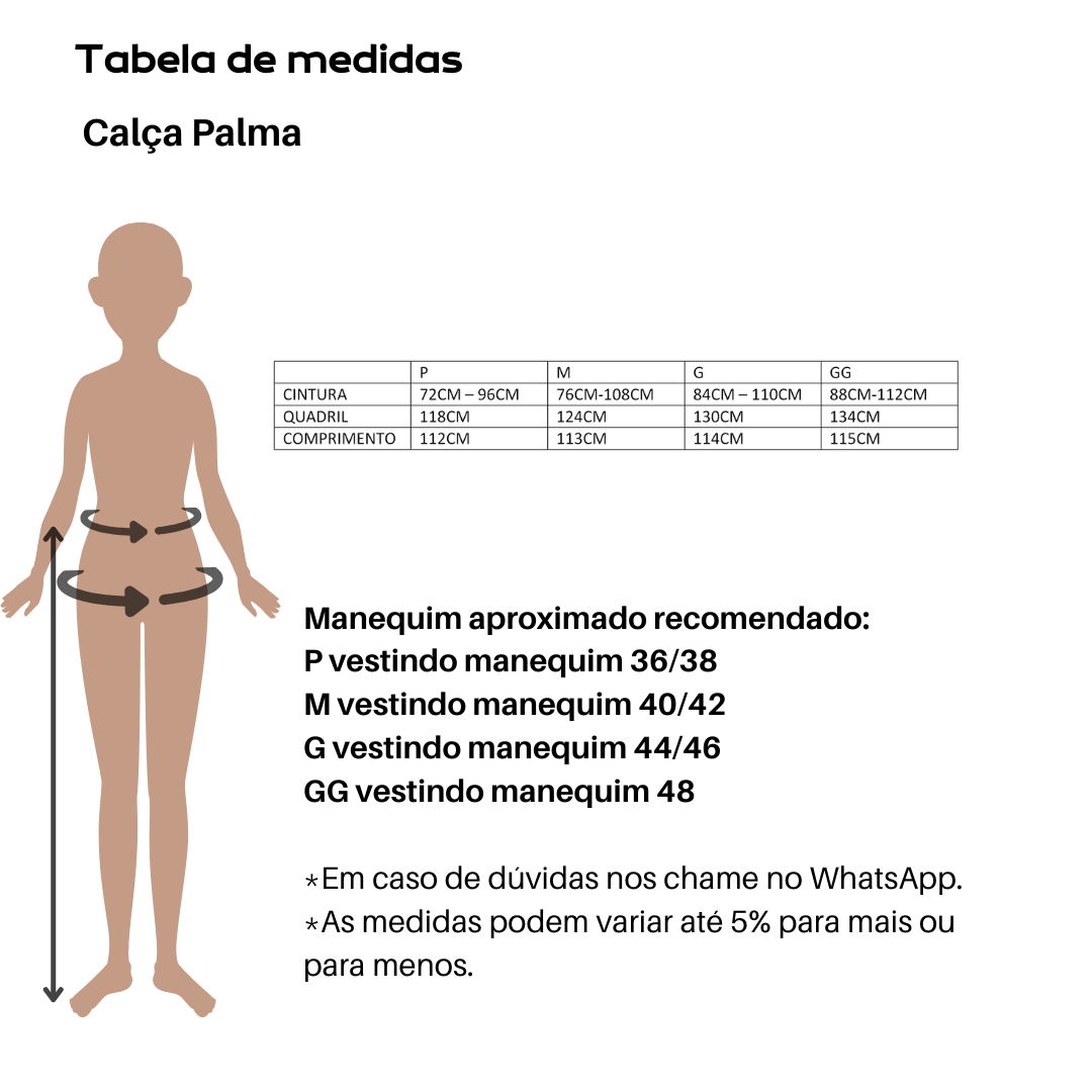 Descrição: Despojada, comfy e muito estilosa! Nossa calça Palma possui elástico na cintura, cordão de ajuste interno e bolsos. Sua modelagem é de cintura média e corte amplo que possibilita movimento e conforto sem perder o estilo.